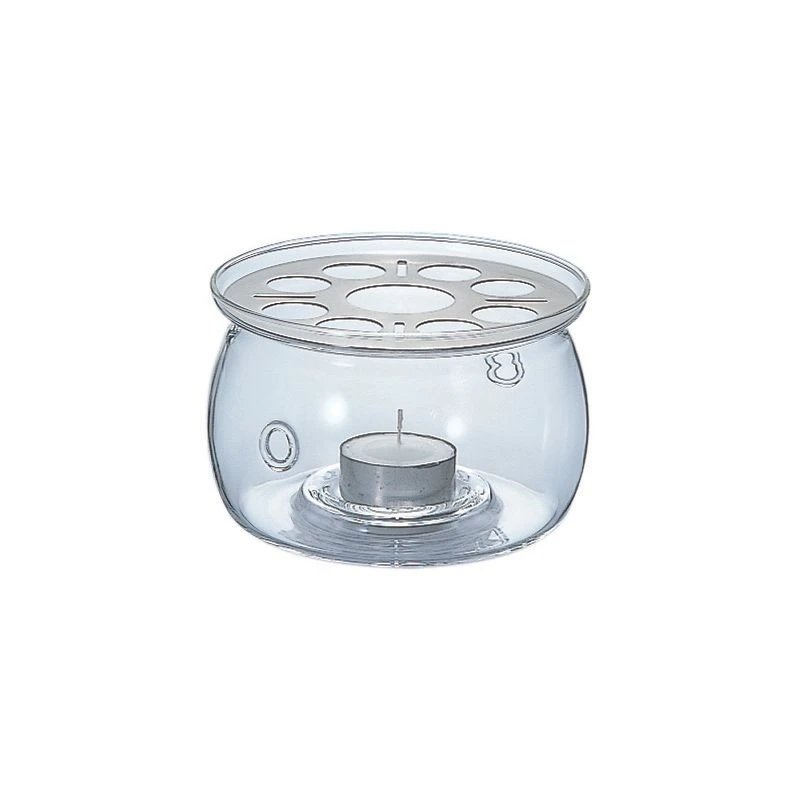 The Hario Tea Warmer features a heat-resistant glass bowl with 2 holes for air-flow, a tealight candle and a metal grate to elevate the teapot above the candle.