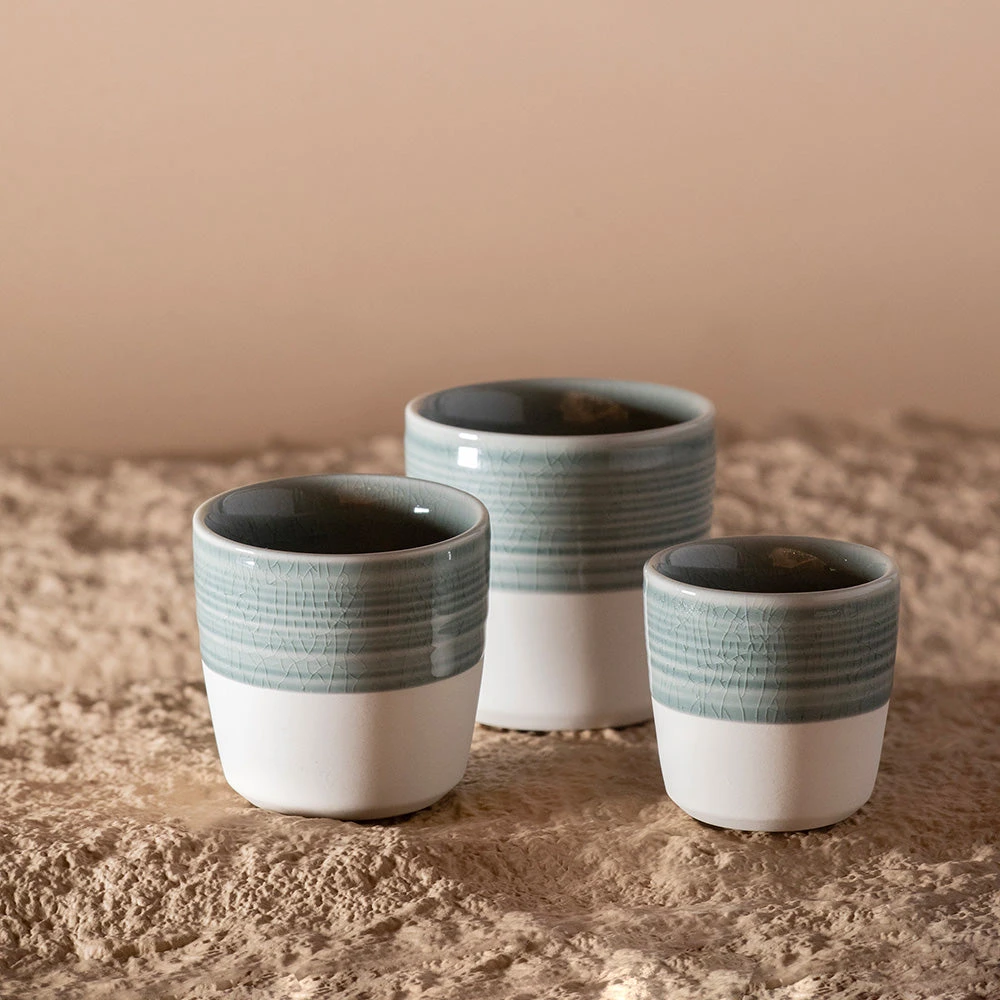 The glaze is special with a crackle surface, with 3 translucent, trendy colours that fits well with the rustic, modern vintage interior trend. They are a prized, pottery glaze that can only be achieved in small studio.